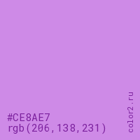 Цвет #CE8AE7 в цветовой модели RGB обозначается тремя октетами (206, 138, 231) в десятичном формате и #CE8AE7 в шестнадцатиричном (hex) формате, которые являются интенсивностью красного 206 (hex CE), интенсивность зелёного 138 (hex 8A) и интенсивность синего 231 (hex E7).