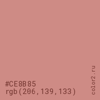 Цвет #CE8B85 в цветовой модели RGB обозначается тремя октетами (206, 139, 133) в десятичном формате и #CE8B85 в шестнадцатиричном (hex) формате, которые являются интенсивностью красного 206 (hex CE), интенсивность зелёного 139 (hex 8B) и интенсивность синего 133 (hex 85).