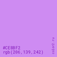 Цвет #CE8BF2 в цветовой модели RGB обозначается тремя октетами (206, 139, 242) в десятичном формате и #CE8BF2 в шестнадцатиричном (hex) формате, которые являются интенсивностью красного 206 (hex CE), интенсивность зелёного 139 (hex 8B) и интенсивность синего 242 (hex F2).
