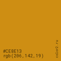 Цвет #CE8E13 в цветовой модели RGB обозначается тремя октетами (206, 142, 19) в десятичном формате и #CE8E13 в шестнадцатиричном (hex) формате, которые являются интенсивностью красного 206 (hex CE), интенсивность зелёного 142 (hex 8E) и интенсивность синего 19 (hex 13).