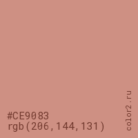Цвет #CE9083 в цветовой модели RGB обозначается тремя октетами (206, 144, 131) в десятичном формате и #CE9083 в шестнадцатиричном (hex) формате, которые являются интенсивностью красного 206 (hex CE), интенсивность зелёного 144 (hex 90) и интенсивность синего 131 (hex 83).