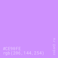 Цвет #CE90FE в цветовой модели RGB обозначается тремя октетами (206, 144, 254) в десятичном формате и #CE90FE в шестнадцатиричном (hex) формате, которые являются интенсивностью красного 206 (hex CE), интенсивность зелёного 144 (hex 90) и интенсивность синего 254 (hex FE).