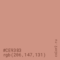 Цвет #CE9383 в цветовой модели RGB обозначается тремя октетами (206, 147, 131) в десятичном формате и #CE9383 в шестнадцатиричном (hex) формате, которые являются интенсивностью красного 206 (hex CE), интенсивность зелёного 147 (hex 93) и интенсивность синего 131 (hex 83).