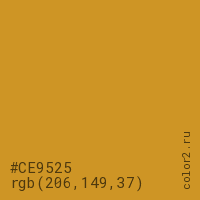 Цвет #CE9525 в цветовой модели RGB обозначается тремя октетами (206, 149, 37) в десятичном формате и #CE9525 в шестнадцатиричном (hex) формате, которые являются интенсивностью красного 206 (hex CE), интенсивность зелёного 149 (hex 95) и интенсивность синего 37 (hex 25).