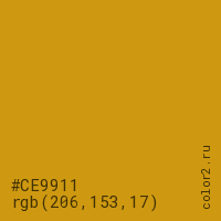 Цвет #CE9911 в цветовой модели RGB обозначается тремя октетами (206, 153, 17) в десятичном формате и #CE9911 в шестнадцатиричном (hex) формате, которые являются интенсивностью красного 206 (hex CE), интенсивность зелёного 153 (hex 99) и интенсивность синего 17 (hex 11).