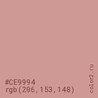 Цвет #CE9994 в цветовой модели RGB обозначается тремя октетами (206, 153, 148) в десятичном формате и #CE9994 в шестнадцатиричном (hex) формате, которые являются интенсивностью красного 206 (hex CE), интенсивность зелёного 153 (hex 99) и интенсивность синего 148 (hex 94).