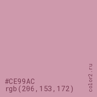 Цвет #CE99AC в цветовой модели RGB обозначается тремя октетами (206, 153, 172) в десятичном формате и #CE99AC в шестнадцатиричном (hex) формате, которые являются интенсивностью красного 206 (hex CE), интенсивность зелёного 153 (hex 99) и интенсивность синего 172 (hex AC).