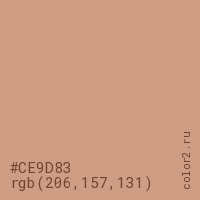 Цвет #CE9D83 в цветовой модели RGB обозначается тремя октетами (206, 157, 131) в десятичном формате и #CE9D83 в шестнадцатиричном (hex) формате, которые являются интенсивностью красного 206 (hex CE), интенсивность зелёного 157 (hex 9D) и интенсивность синего 131 (hex 83).