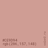 Цвет #CE9D94 в цветовой модели RGB обозначается тремя октетами (206, 157, 148) в десятичном формате и #CE9D94 в шестнадцатиричном (hex) формате, которые являются интенсивностью красного 206 (hex CE), интенсивность зелёного 157 (hex 9D) и интенсивность синего 148 (hex 94).