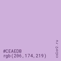 Цвет #CEAEDB в цветовой модели RGB обозначается тремя октетами (206, 174, 219) в десятичном формате и #CEAEDB в шестнадцатиричном (hex) формате, которые являются интенсивностью красного 206 (hex CE), интенсивность зелёного 174 (hex AE) и интенсивность синего 219 (hex DB).
