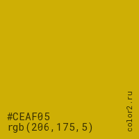 Цвет #CEAF05 в цветовой модели RGB обозначается тремя октетами (206, 175, 5) в десятичном формате и #CEAF05 в шестнадцатиричном (hex) формате, которые являются интенсивностью красного 206 (hex CE), интенсивность зелёного 175 (hex AF) и интенсивность синего 5 (hex 05).