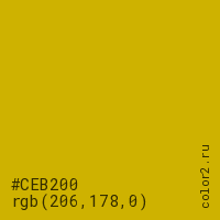 Цвет #CEB200 в цветовой модели RGB обозначается тремя октетами (206, 178, 0) в десятичном формате и #CEB200 в шестнадцатиричном (hex) формате, которые являются интенсивностью красного 206 (hex CE), интенсивность зелёного 178 (hex B2) и интенсивность синего 0 (hex 00).