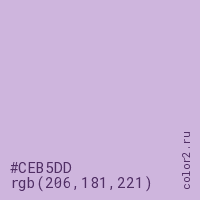 Цвет #CEB5DD в цветовой модели RGB обозначается тремя октетами (206, 181, 221) в десятичном формате и #CEB5DD в шестнадцатиричном (hex) формате, которые являются интенсивностью красного 206 (hex CE), интенсивность зелёного 181 (hex B5) и интенсивность синего 221 (hex DD).