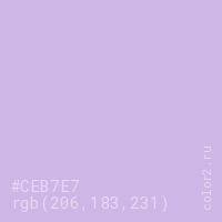 Цвет #CEB7E7 в цветовой модели RGB обозначается тремя октетами (206, 183, 231) в десятичном формате и #CEB7E7 в шестнадцатиричном (hex) формате, которые являются интенсивностью красного 206 (hex CE), интенсивность зелёного 183 (hex B7) и интенсивность синего 231 (hex E7).