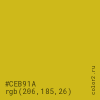 Цвет #CEB91A в цветовой модели RGB обозначается тремя октетами (206, 185, 26) в десятичном формате и #CEB91A в шестнадцатиричном (hex) формате, которые являются интенсивностью красного 206 (hex CE), интенсивность зелёного 185 (hex B9) и интенсивность синего 26 (hex 1A).