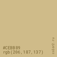 Цвет #CEBB89 в цветовой модели RGB обозначается тремя октетами (206, 187, 137) в десятичном формате и #CEBB89 в шестнадцатиричном (hex) формате, которые являются интенсивностью красного 206 (hex CE), интенсивность зелёного 187 (hex BB) и интенсивность синего 137 (hex 89).