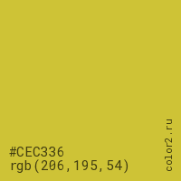 Цвет #CEC336 в цветовой модели RGB обозначается тремя октетами (206, 195, 54) в десятичном формате и #CEC336 в шестнадцатиричном (hex) формате, которые являются интенсивностью красного 206 (hex CE), интенсивность зелёного 195 (hex C3) и интенсивность синего 54 (hex 36).