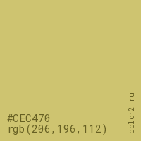 Цвет #CEC470 в цветовой модели RGB обозначается тремя октетами (206, 196, 112) в десятичном формате и #CEC470 в шестнадцатиричном (hex) формате, которые являются интенсивностью красного 206 (hex CE), интенсивность зелёного 196 (hex C4) и интенсивность синего 112 (hex 70).