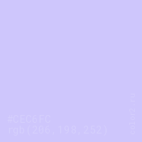Цвет #CEC6FC в цветовой модели RGB обозначается тремя октетами (206, 198, 252) в десятичном формате и #CEC6FC в шестнадцатиричном (hex) формате, которые являются интенсивностью красного 206 (hex CE), интенсивность зелёного 198 (hex C6) и интенсивность синего 252 (hex FC).