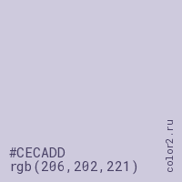 Цвет #CECADD в цветовой модели RGB обозначается тремя октетами (206, 202, 221) в десятичном формате и #CECADD в шестнадцатиричном (hex) формате, которые являются интенсивностью красного 206 (hex CE), интенсивность зелёного 202 (hex CA) и интенсивность синего 221 (hex DD).