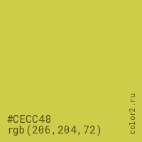 Цвет #CECC48 в цветовой модели RGB обозначается тремя октетами (206, 204, 72) в десятичном формате и #CECC48 в шестнадцатиричном (hex) формате, которые являются интенсивностью красного 206 (hex CE), интенсивность зелёного 204 (hex CC) и интенсивность синего 72 (hex 48).