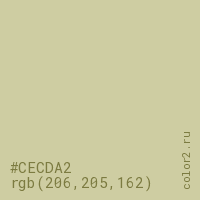 Цвет #CECDA2 в цветовой модели RGB обозначается тремя октетами (206, 205, 162) в десятичном формате и #CECDA2 в шестнадцатиричном (hex) формате, которые являются интенсивностью красного 206 (hex CE), интенсивность зелёного 205 (hex CD) и интенсивность синего 162 (hex A2).