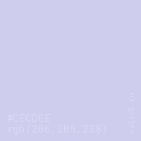 Цвет #CECDEE в цветовой модели RGB обозначается тремя октетами (206, 205, 238) в десятичном формате и #CECDEE в шестнадцатиричном (hex) формате, которые являются интенсивностью красного 206 (hex CE), интенсивность зелёного 205 (hex CD) и интенсивность синего 238 (hex EE).