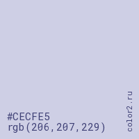 Цвет #CECFE5 в цветовой модели RGB обозначается тремя октетами (206, 207, 229) в десятичном формате и #CECFE5 в шестнадцатиричном (hex) формате, которые являются интенсивностью красного 206 (hex CE), интенсивность зелёного 207 (hex CF) и интенсивность синего 229 (hex E5).