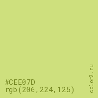 Цвет #CEE07D в цветовой модели RGB обозначается тремя октетами (206, 224, 125) в десятичном формате и #CEE07D в шестнадцатиричном (hex) формате, которые являются интенсивностью красного 206 (hex CE), интенсивность зелёного 224 (hex E0) и интенсивность синего 125 (hex 7D).