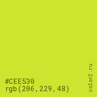 Цвет #CEE530 в цветовой модели RGB обозначается тремя октетами (206, 229, 48) в десятичном формате и #CEE530 в шестнадцатиричном (hex) формате, которые являются интенсивностью красного 206 (hex CE), интенсивность зелёного 229 (hex E5) и интенсивность синего 48 (hex 30).