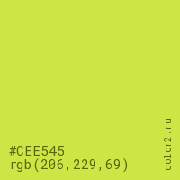 Цвет #CEE545 в цветовой модели RGB обозначается тремя октетами (206, 229, 69) в десятичном формате и #CEE545 в шестнадцатиричном (hex) формате, которые являются интенсивностью красного 206 (hex CE), интенсивность зелёного 229 (hex E5) и интенсивность синего 69 (hex 45).