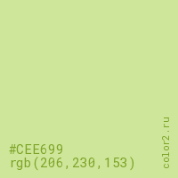 Цвет #CEE699 в цветовой модели RGB обозначается тремя октетами (206, 230, 153) в десятичном формате и #CEE699 в шестнадцатиричном (hex) формате, которые являются интенсивностью красного 206 (hex CE), интенсивность зелёного 230 (hex E6) и интенсивность синего 153 (hex 99).