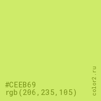 Цвет #CEEB69 в цветовой модели RGB обозначается тремя октетами (206, 235, 105) в десятичном формате и #CEEB69 в шестнадцатиричном (hex) формате, которые являются интенсивностью красного 206 (hex CE), интенсивность зелёного 235 (hex EB) и интенсивность синего 105 (hex 69).