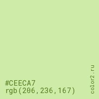 Цвет #CEECA7 в цветовой модели RGB обозначается тремя октетами (206, 236, 167) в десятичном формате и #CEECA7 в шестнадцатиричном (hex) формате, которые являются интенсивностью красного 206 (hex CE), интенсивность зелёного 236 (hex EC) и интенсивность синего 167 (hex A7).