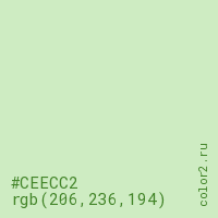 Цвет #CEECC2 в цветовой модели RGB обозначается тремя октетами (206, 236, 194) в десятичном формате и #CEECC2 в шестнадцатиричном (hex) формате, которые являются интенсивностью красного 206 (hex CE), интенсивность зелёного 236 (hex EC) и интенсивность синего 194 (hex C2).