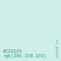 Цвет #CEEEE9 в цветовой модели RGB обозначается тремя октетами (206, 238, 233) в десятичном формате и #CEEEE9 в шестнадцатиричном (hex) формате, которые являются интенсивностью красного 206 (hex CE), интенсивность зелёного 238 (hex EE) и интенсивность синего 233 (hex E9).