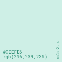 Цвет #CEEFE6 в цветовой модели RGB обозначается тремя октетами (206, 239, 230) в десятичном формате и #CEEFE6 в шестнадцатиричном (hex) формате, которые являются интенсивностью красного 206 (hex CE), интенсивность зелёного 239 (hex EF) и интенсивность синего 230 (hex E6).