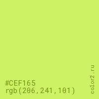 Цвет #CEF165 в цветовой модели RGB обозначается тремя октетами (206, 241, 101) в десятичном формате и #CEF165 в шестнадцатиричном (hex) формате, которые являются интенсивностью красного 206 (hex CE), интенсивность зелёного 241 (hex F1) и интенсивность синего 101 (hex 65).