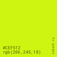 Цвет #CEF512 в цветовой модели RGB обозначается тремя октетами (206, 245, 18) в десятичном формате и #CEF512 в шестнадцатиричном (hex) формате, которые являются интенсивностью красного 206 (hex CE), интенсивность зелёного 245 (hex F5) и интенсивность синего 18 (hex 12).