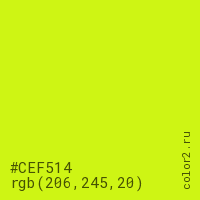 Цвет #CEF514 в цветовой модели RGB обозначается тремя октетами (206, 245, 20) в десятичном формате и #CEF514 в шестнадцатиричном (hex) формате, которые являются интенсивностью красного 206 (hex CE), интенсивность зелёного 245 (hex F5) и интенсивность синего 20 (hex 14).