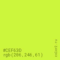 Цвет #CEF63D в цветовой модели RGB обозначается тремя октетами (206, 246, 61) в десятичном формате и #CEF63D в шестнадцатиричном (hex) формате, которые являются интенсивностью красного 206 (hex CE), интенсивность зелёного 246 (hex F6) и интенсивность синего 61 (hex 3D).