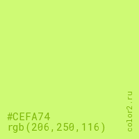 Цвет #CEFA74 в цветовой модели RGB обозначается тремя октетами (206, 250, 116) в десятичном формате и #CEFA74 в шестнадцатиричном (hex) формате, которые являются интенсивностью красного 206 (hex CE), интенсивность зелёного 250 (hex FA) и интенсивность синего 116 (hex 74).