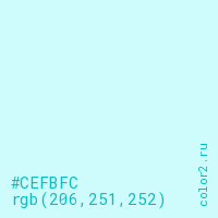 Цвет #CEFBFC в цветовой модели RGB обозначается тремя октетами (206, 251, 252) в десятичном формате и #CEFBFC в шестнадцатиричном (hex) формате, которые являются интенсивностью красного 206 (hex CE), интенсивность зелёного 251 (hex FB) и интенсивность синего 252 (hex FC).