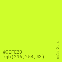 Цвет #CEFE2B в цветовой модели RGB обозначается тремя октетами (206, 254, 43) в десятичном формате и #CEFE2B в шестнадцатиричном (hex) формате, которые являются интенсивностью красного 206 (hex CE), интенсивность зелёного 254 (hex FE) и интенсивность синего 43 (hex 2B).