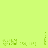 Цвет #CEFE74 в цветовой модели RGB обозначается тремя октетами (206, 254, 116) в десятичном формате и #CEFE74 в шестнадцатиричном (hex) формате, которые являются интенсивностью красного 206 (hex CE), интенсивность зелёного 254 (hex FE) и интенсивность синего 116 (hex 74).