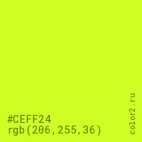 Цвет #CEFF24 в цветовой модели RGB обозначается тремя октетами (206, 255, 36) в десятичном формате и #CEFF24 в шестнадцатиричном (hex) формате, которые являются интенсивностью красного 206 (hex CE), интенсивность зелёного 255 (hex FF) и интенсивность синего 36 (hex 24).