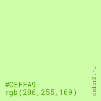 Цвет #CEFFA9 в цветовой модели RGB обозначается тремя октетами (206, 255, 169) в десятичном формате и #CEFFA9 в шестнадцатиричном (hex) формате, которые являются интенсивностью красного 206 (hex CE), интенсивность зелёного 255 (hex FF) и интенсивность синего 169 (hex A9).