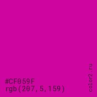 Цвет #CF059F в цветовой модели RGB обозначается тремя октетами (207, 5, 159) в десятичном формате и #CF059F в шестнадцатиричном (hex) формате, которые являются интенсивностью красного 207 (hex CF), интенсивность зелёного 5 (hex 05) и интенсивность синего 159 (hex 9F).