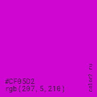 Цвет #CF05D2 в цветовой модели RGB обозначается тремя октетами (207, 5, 210) в десятичном формате и #CF05D2 в шестнадцатиричном (hex) формате, которые являются интенсивностью красного 207 (hex CF), интенсивность зелёного 5 (hex 05) и интенсивность синего 210 (hex D2).