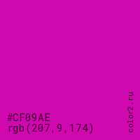 Цвет #CF09AE в цветовой модели RGB обозначается тремя октетами (207, 9, 174) в десятичном формате и #CF09AE в шестнадцатиричном (hex) формате, которые являются интенсивностью красного 207 (hex CF), интенсивность зелёного 9 (hex 09) и интенсивность синего 174 (hex AE).